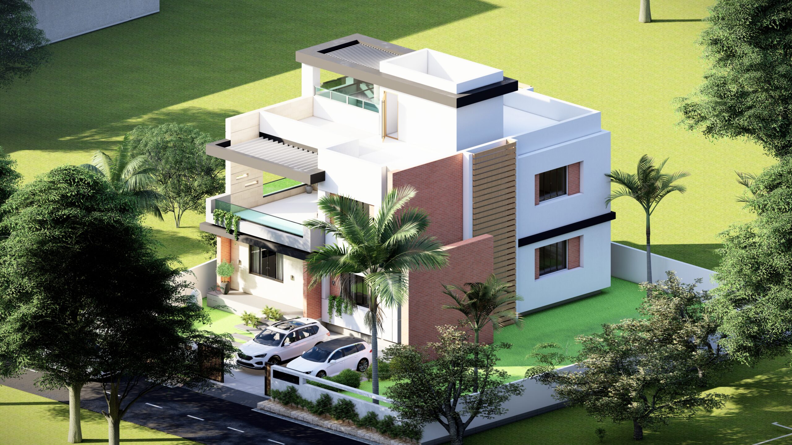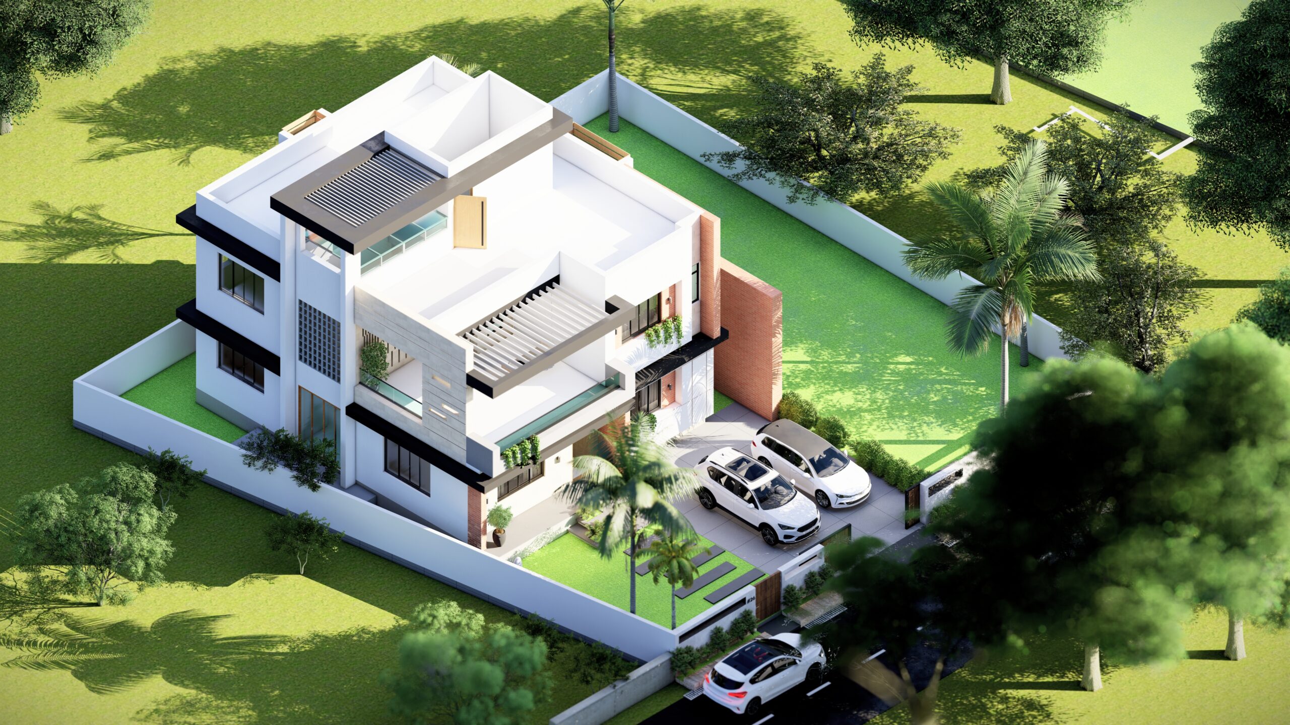 Trikaya is a modern 5BHK bungalow in Vita, designed on a 5600 sq.ft. plot with a 3000 sq.ft. built-up area, catering to a multigenerational family. Anchored by a double-height dining area, the layout promotes light, ventilation, and vertical connectivity. The façade blends exposed brick, natural textures, and wood-finish details for a warm, minimalist appeal. Landscaped terraces and a sleek pergola enhance leisure spaces and add a contemporary touch. Site planning ensures privacy while integrating functional green buffers. Trikaya balances modern living with familial warmth and timeless elegance.